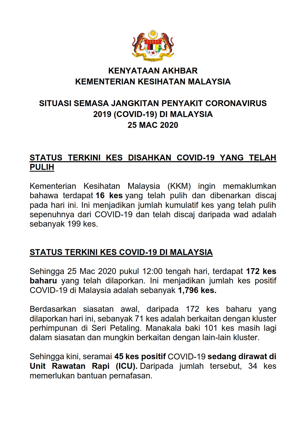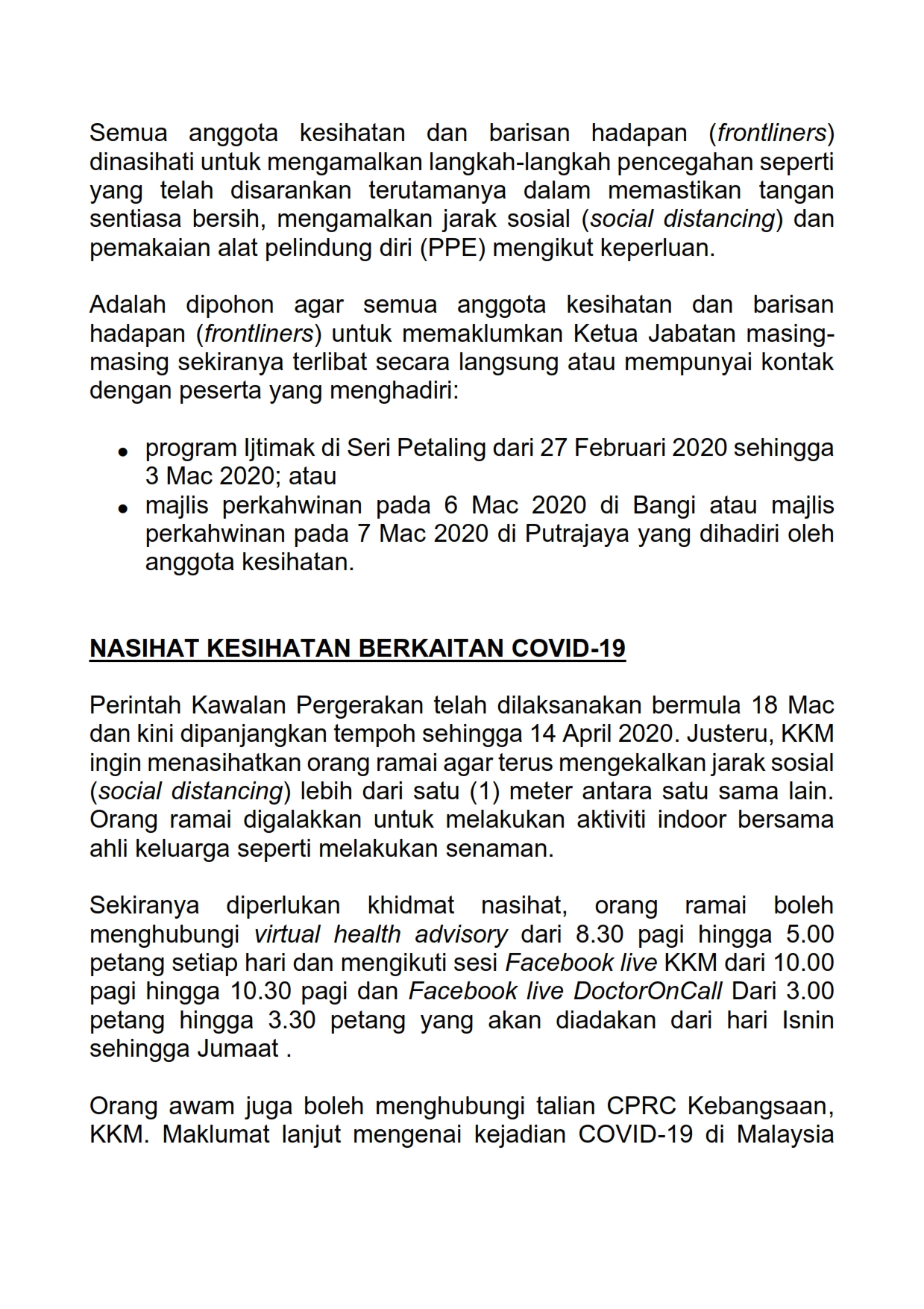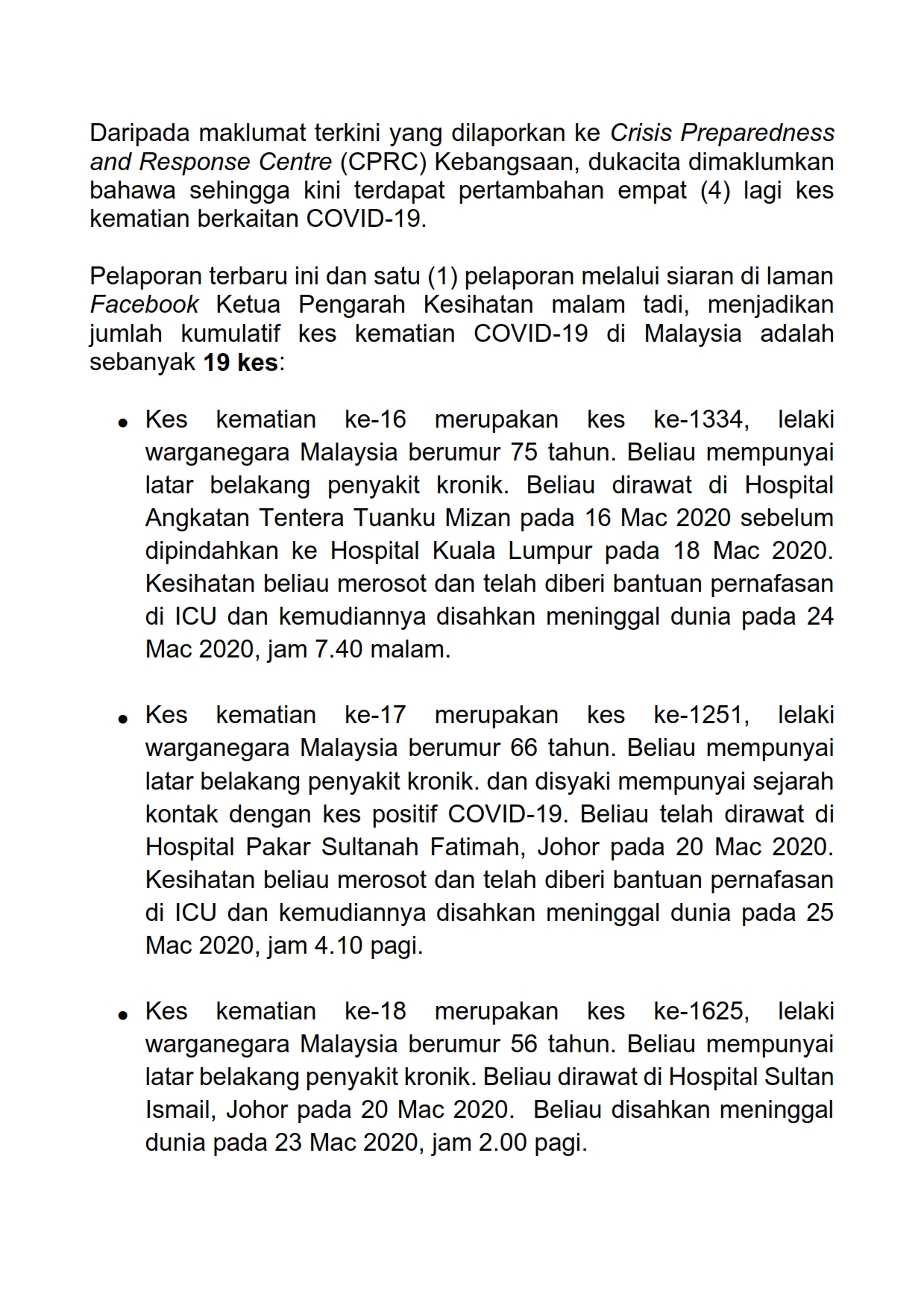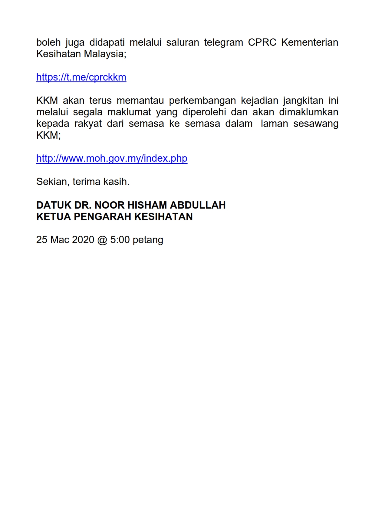 Kenyataan Akhbar KP KKM 25/03/2020 0500 PM Aiman Siaran Media 25 Mac 2020 Jumlah paparan: 1296 Rating: ( 0 Rating ) Sila beri kadar Undi 1 Undi 2 Undi 3 Undi 4 Undi 5 Lihat / Muat Turun PDF Facebook Twitter Seterusnya Seterusnya