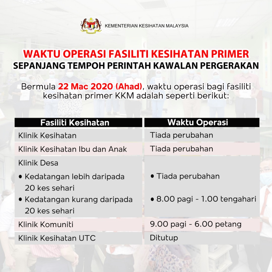 COVID-19 - Waktu Operasi Fasiliti Kesihatan Primer Sepanjang Tempoh PKP Asrul Nasihat 26 Mac 2020 Jumlah paparan: 1281 Rating: ( 0 Rating ) Sila beri kadar Undi 1 Undi 2 Undi 3 Undi 4 Undi 5 Lihat / Muat Turun JPG Facebook Twitter Seterusnya Seterusnya