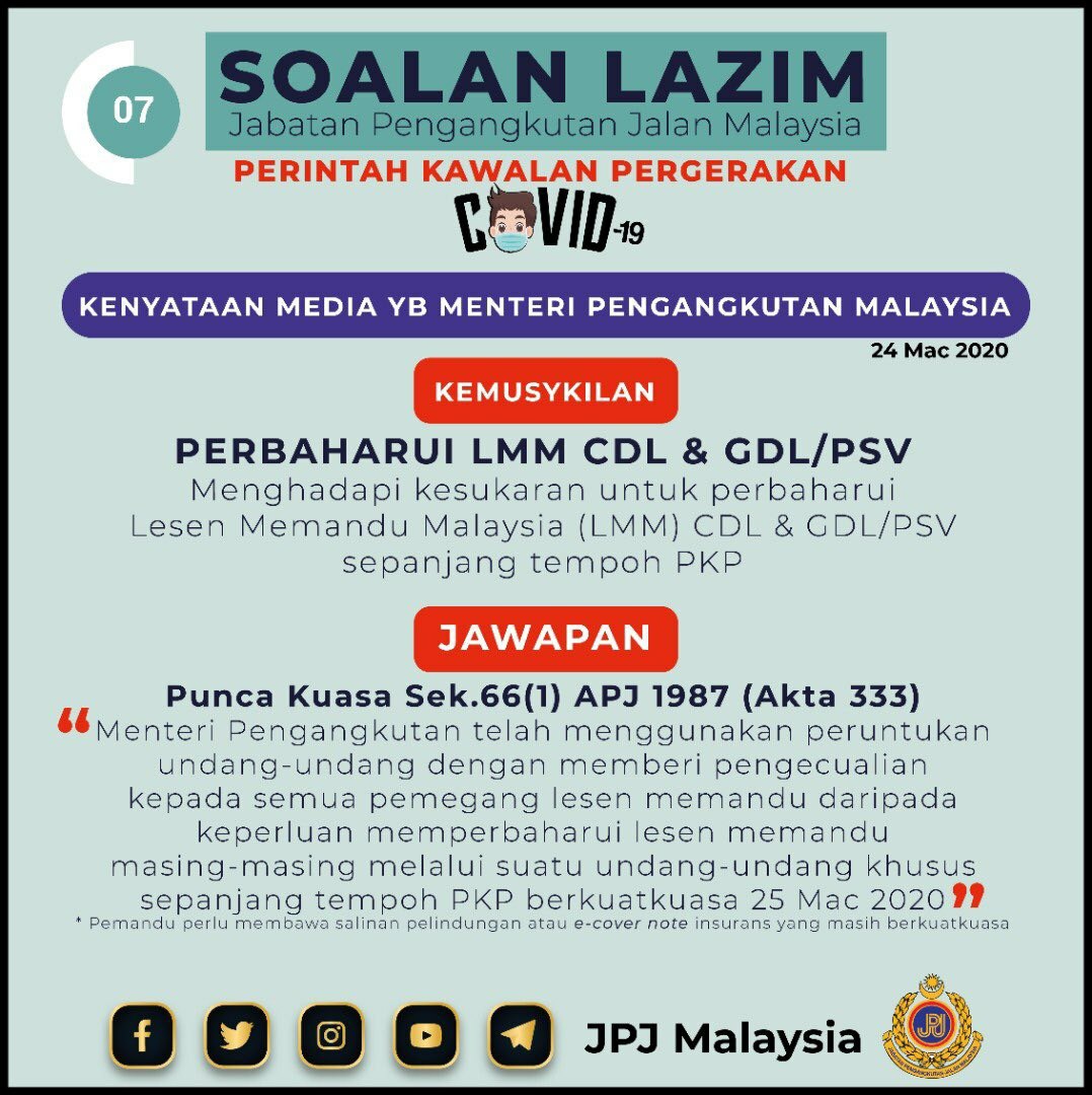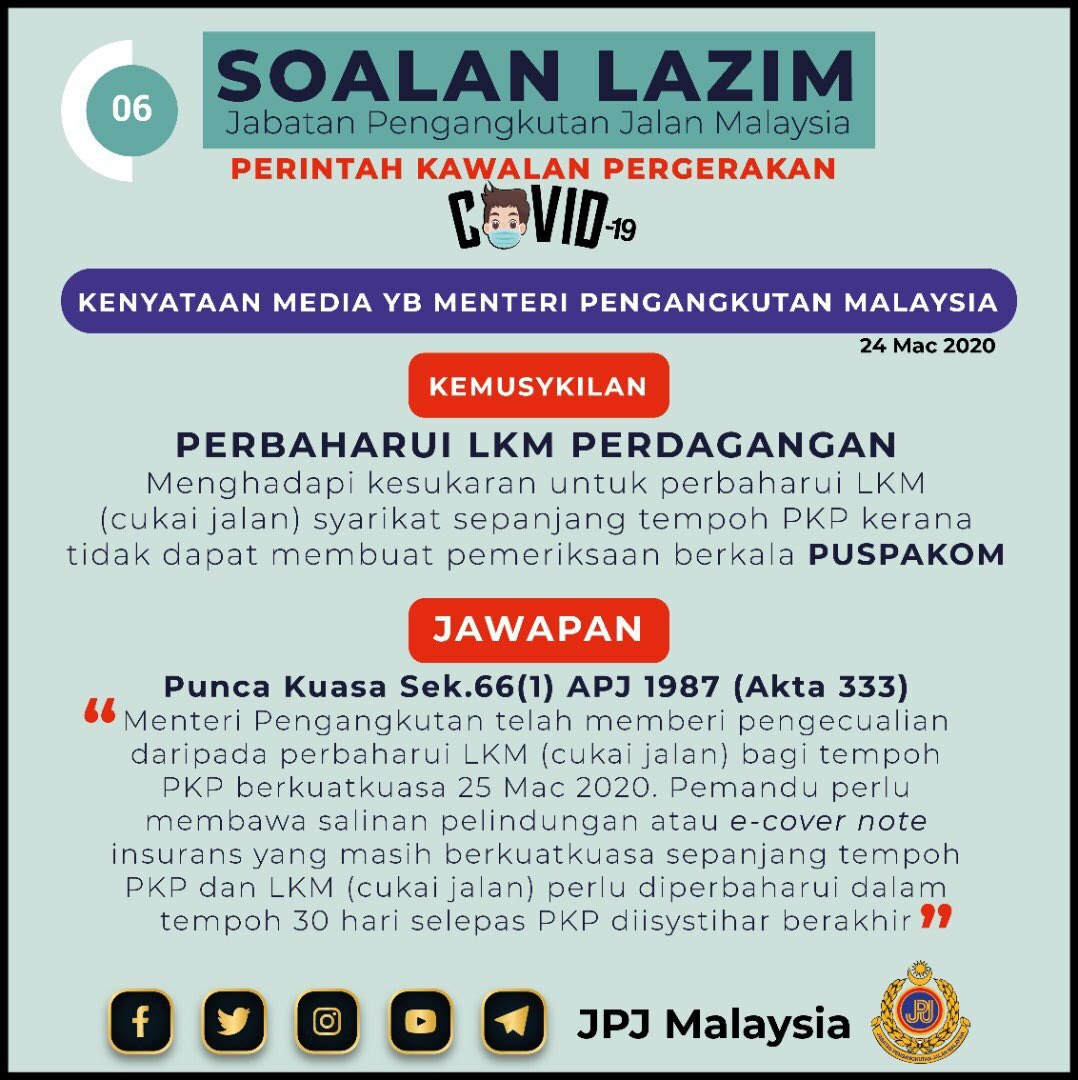JPJ - Soalan Lazim PKP : Kenyataan Media YB Menteri Pengangkutan Malaysia Asrul Siaran Media 26 Mac 2020 Jumlah paparan: 1270 Rating: ( 0 Rating ) Sila beri kadar Undi 1 Undi 2 Undi 3 Undi 4 Undi 5 Facebook Twitter Seterusnya Seterusnya