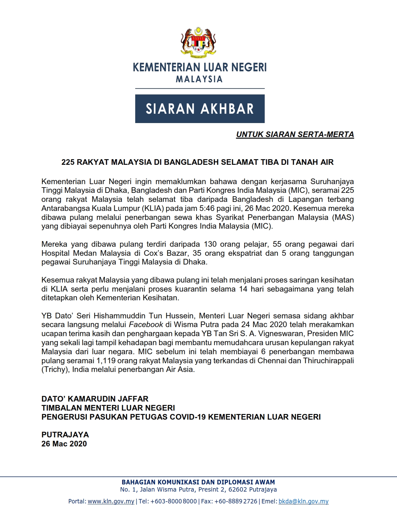 Siaran Akhbar Kementerian Luar Negeri 26/03/2020 0100PM Aiman Siaran Media 26 Mac 2020 Jumlah paparan: 1163 Rating: ( 0 Rating ) Sila beri kadar Undi 1 Undi 2 Undi 3 Undi 4 Undi 5 /bencana2/images/ndcc/documents/covid19/siaranmedia/SIARAN_MEDIA_202003_17.pdf Facebook Twitter Seterusnya Seterusnya