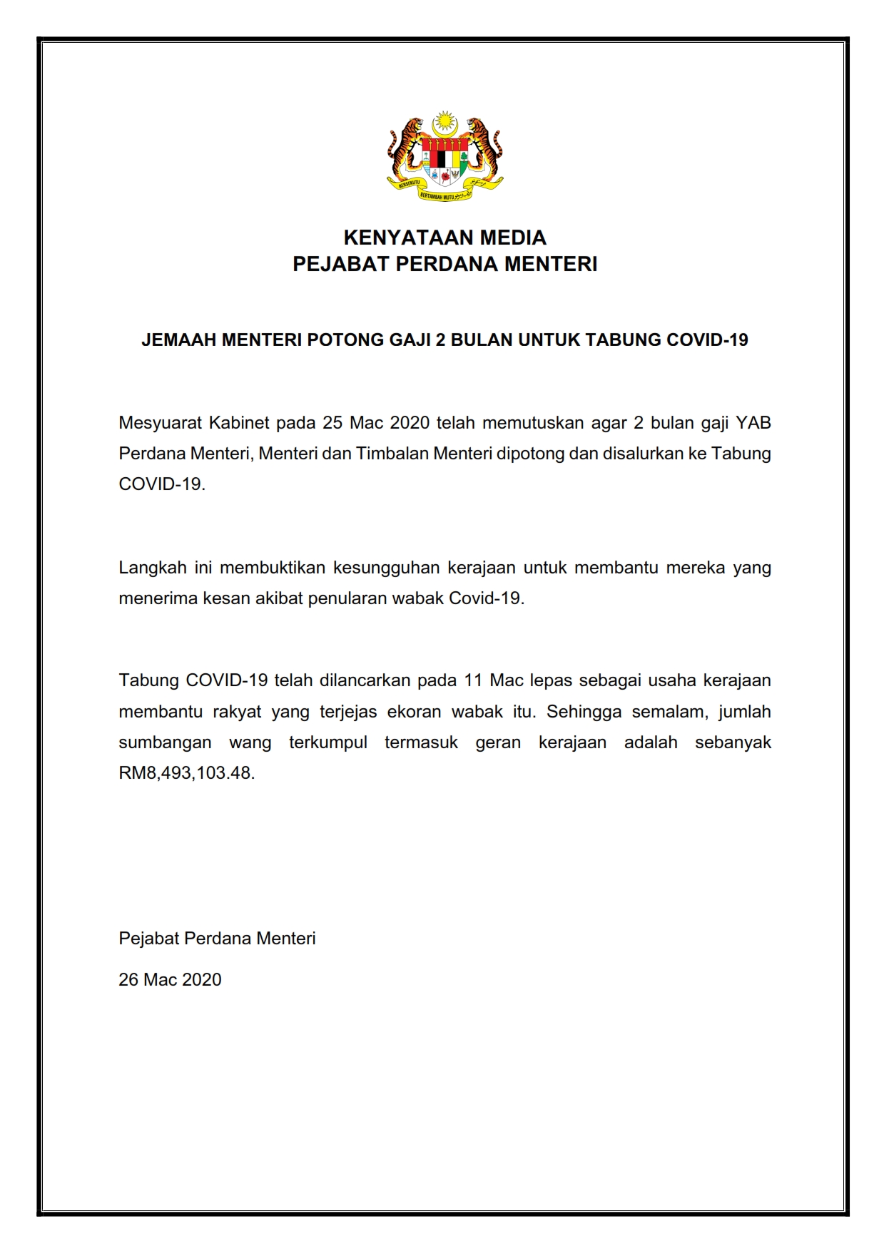 Kenyataan Media Pejabat Perdana Menteri 26/03/2020 Aiman Siaran Media 26 Mac 2020 Jumlah paparan: 1183 Rating: ( 0 Rating ) Sila beri kadar Undi 1 Undi 2 Undi 3 Undi 4 Undi 5 /bencana2/images/ndcc/documents/covid19/siaranmedia/SIARAN_MEDIA_202003_17.pdf Facebook Twitter Seterusnya Seterusnya