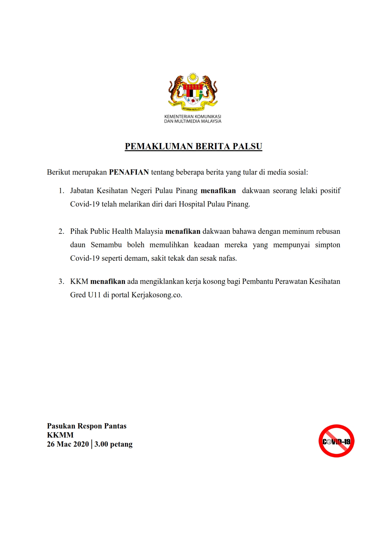 Pemakluman Berita Palsu Kementerian Komunikasi Dan Multimedia 26/03/2020 0300PM Aiman Siaran Media 26 Mac 2020 Jumlah paparan: 674 Rating: ( 0 Rating ) Sila beri kadar Undi 1 Undi 2 Undi 3 Undi 4 Undi 5 Lihat / Muat Turun JPG Facebook Twitter Seterusnya Seterusnya