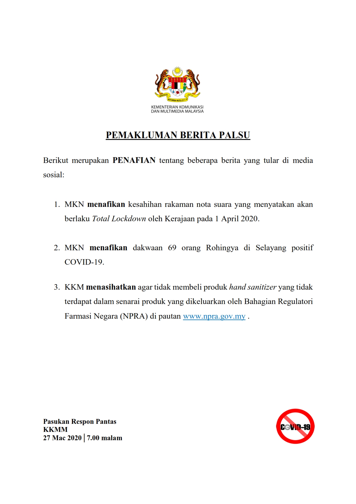 Pemakluman Berita Palsu Kementerian Komunikasi Dan Multimedia Malaysia 27/03/2020 0700 PM Aiman Siaran Media 27 Mac 2020 Jumlah paparan: 889 Rating: ( 0 Rating ) Sila beri kadar Undi 1 Undi 2 Undi 3 Undi 4 Undi 5 Lihat / Muat Turun PDF Facebook Twitter Seterusnya Seterusnya