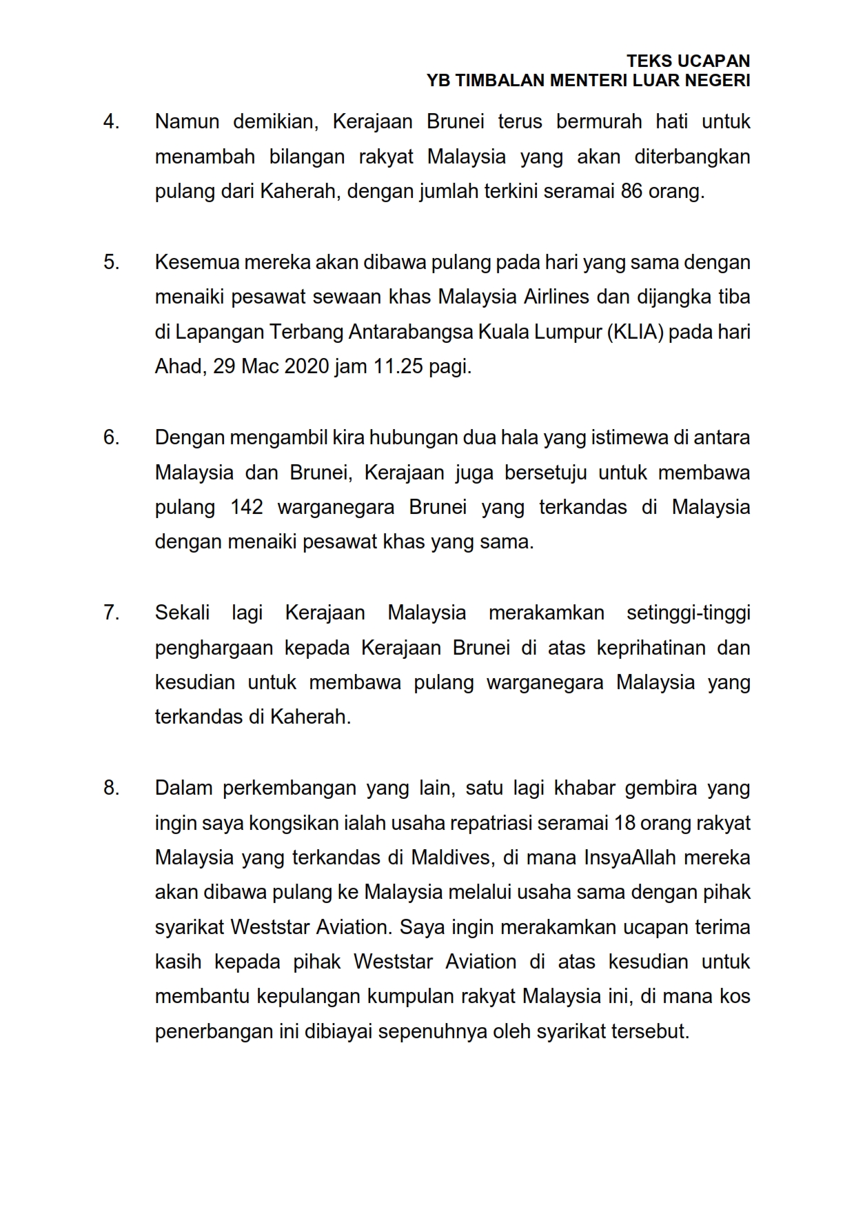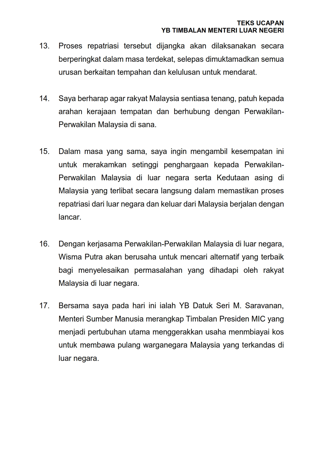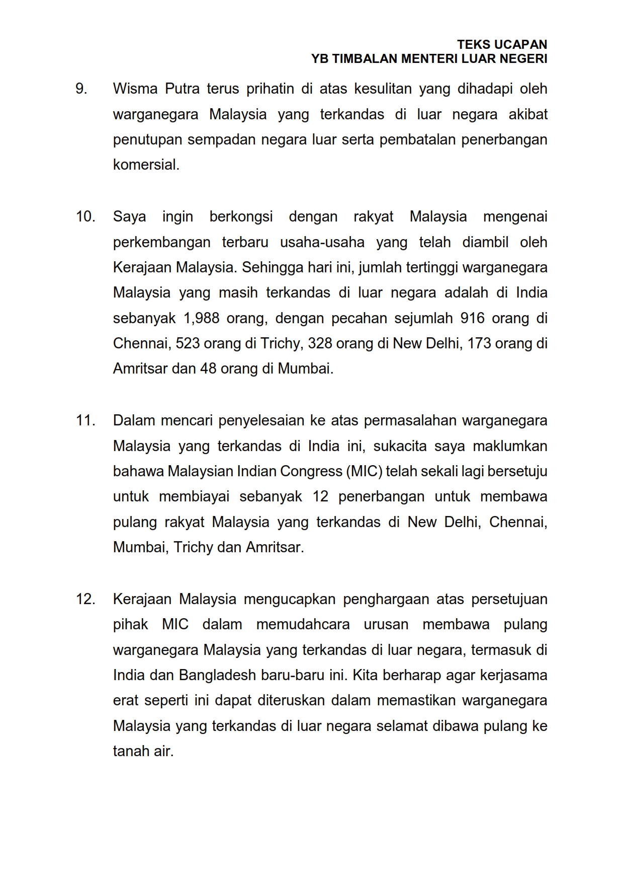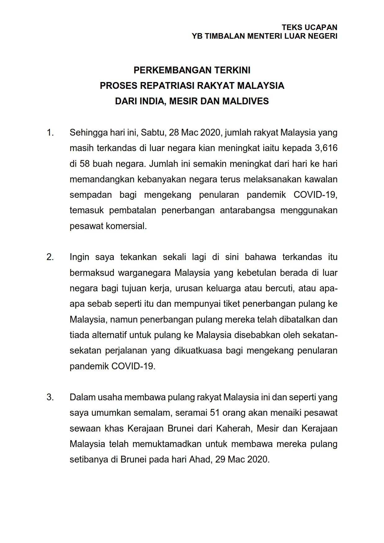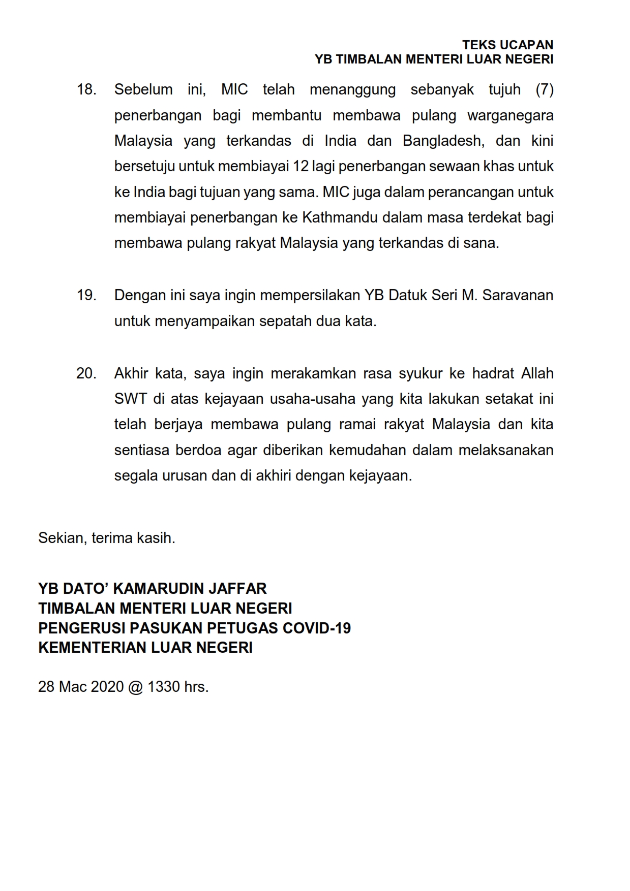 Teks Ucapan YB Timbalan Menteri Luar Negeri 28/03/2020 Aiman Siaran Media 28 Mac 2020 Jumlah paparan: 1488 Rating: ( 0 Rating ) Sila beri kadar Undi 1 Undi 2 Undi 3 Undi 4 Undi 5 Lihat / Muat Turun PDF Facebook Twitter Seterusnya Seterusnya