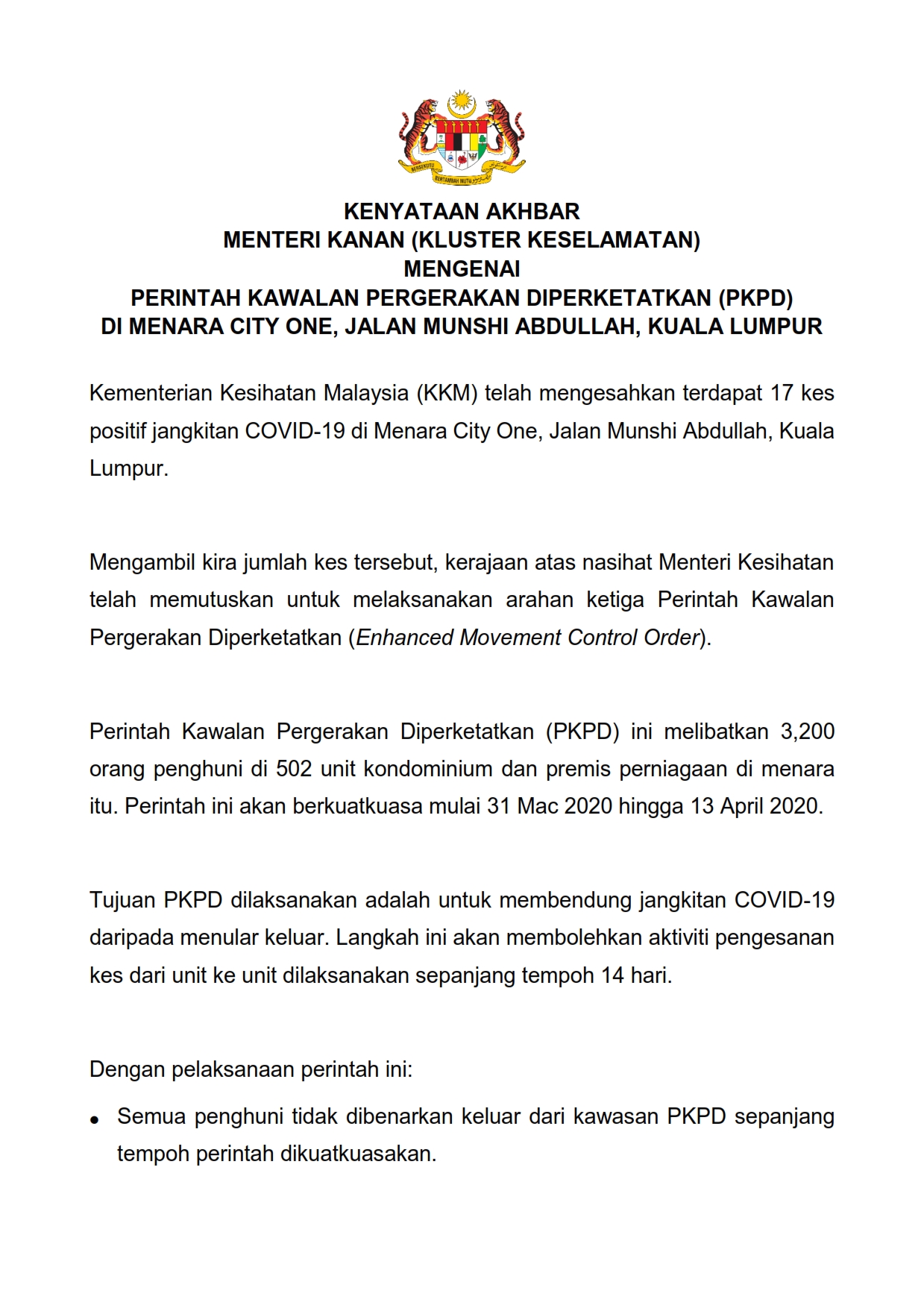 Kenyataan Akhbar Menteri Kanan (Kluster Keselamatan) Mengenai Perintah Kawalan Pergerakan Diperketatkan 30/03/2020 Aiman Siaran Media 30 Mac 2020 Jumlah paparan: 979 Rating: ( 0 Rating ) Sila beri kadar Undi 1 Undi 2 Undi 3 Undi 4 Undi 5 /bencana2/images/ndcc/documents/covid19/siaranmedia/SIARAN_MEDIA_20200330_15.pdf Facebook Twitter Seterusnya Seterusnya