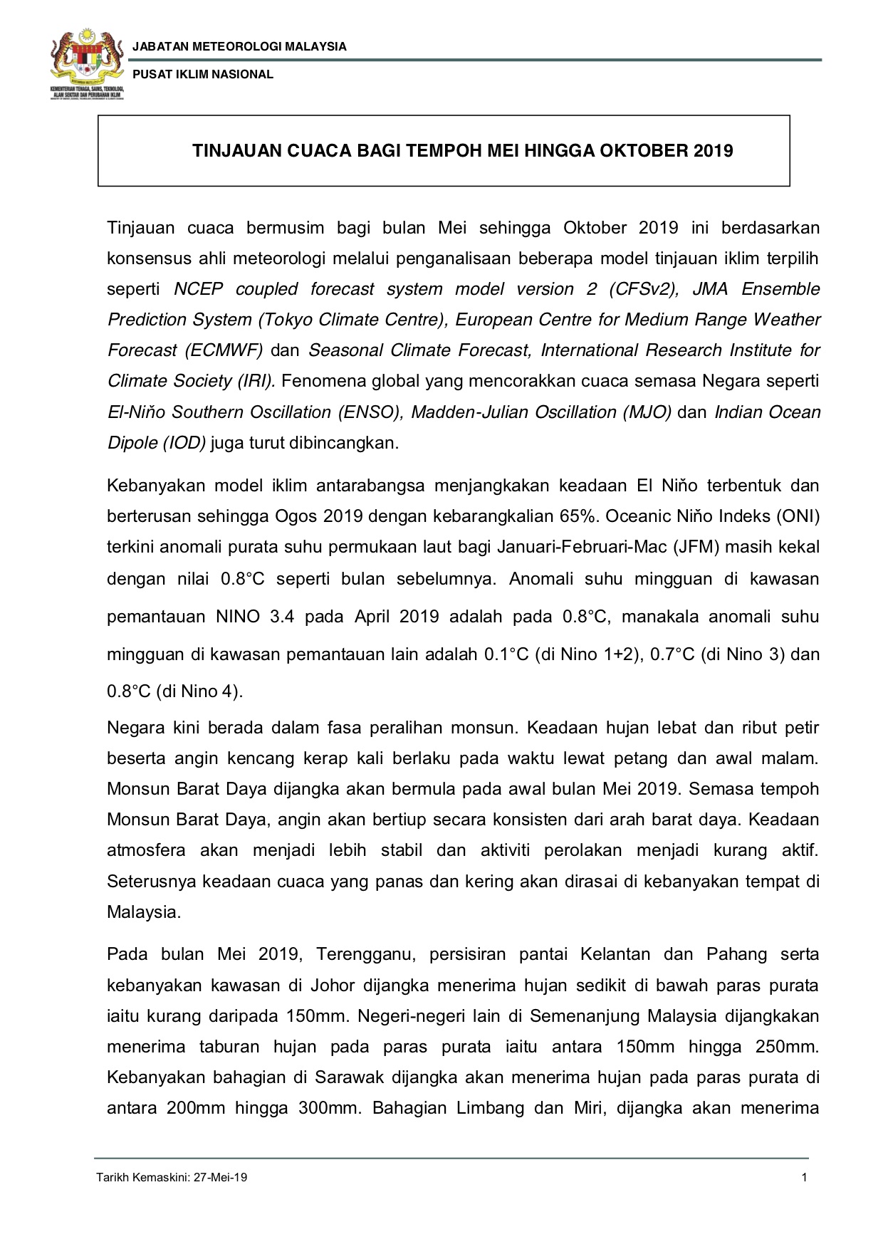 Tinjauan Cuaca Bagi Tempoh Mei Hingga Oktober 2019 Azmin Cuaca 02 Januari 2019 Jumlah paparan: 1024 Rating: ( 0 Rating ) Sila beri kadar Undi 1 Undi 2 Undi 3 Undi 4 Undi 5 Lihat / Muat Turun Facebook Twitter Seterusnya