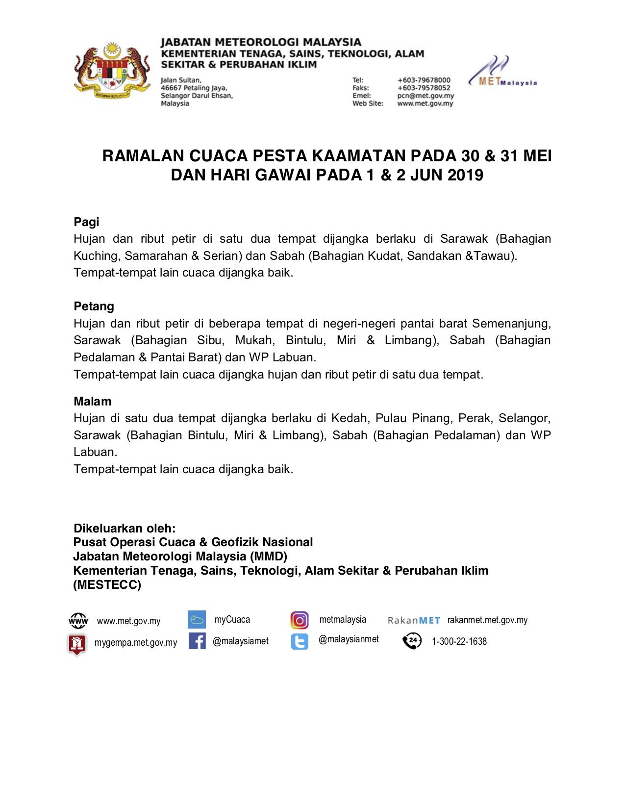 Ramalan Cuaca Pesta Kaamatan 30 & 31 Mei dan Hari Gawai 1 & 2 Jun 2019 Azmin Cuaca 29 Mei 2019 Jumlah paparan: 963 Rating: ( 0 Rating ) Sila beri kadar Undi 1 Undi 2 Undi 3 Undi 4 Undi 5 Lihat / Muat Turun Facebook Twitter Seterusnya Seterusnya