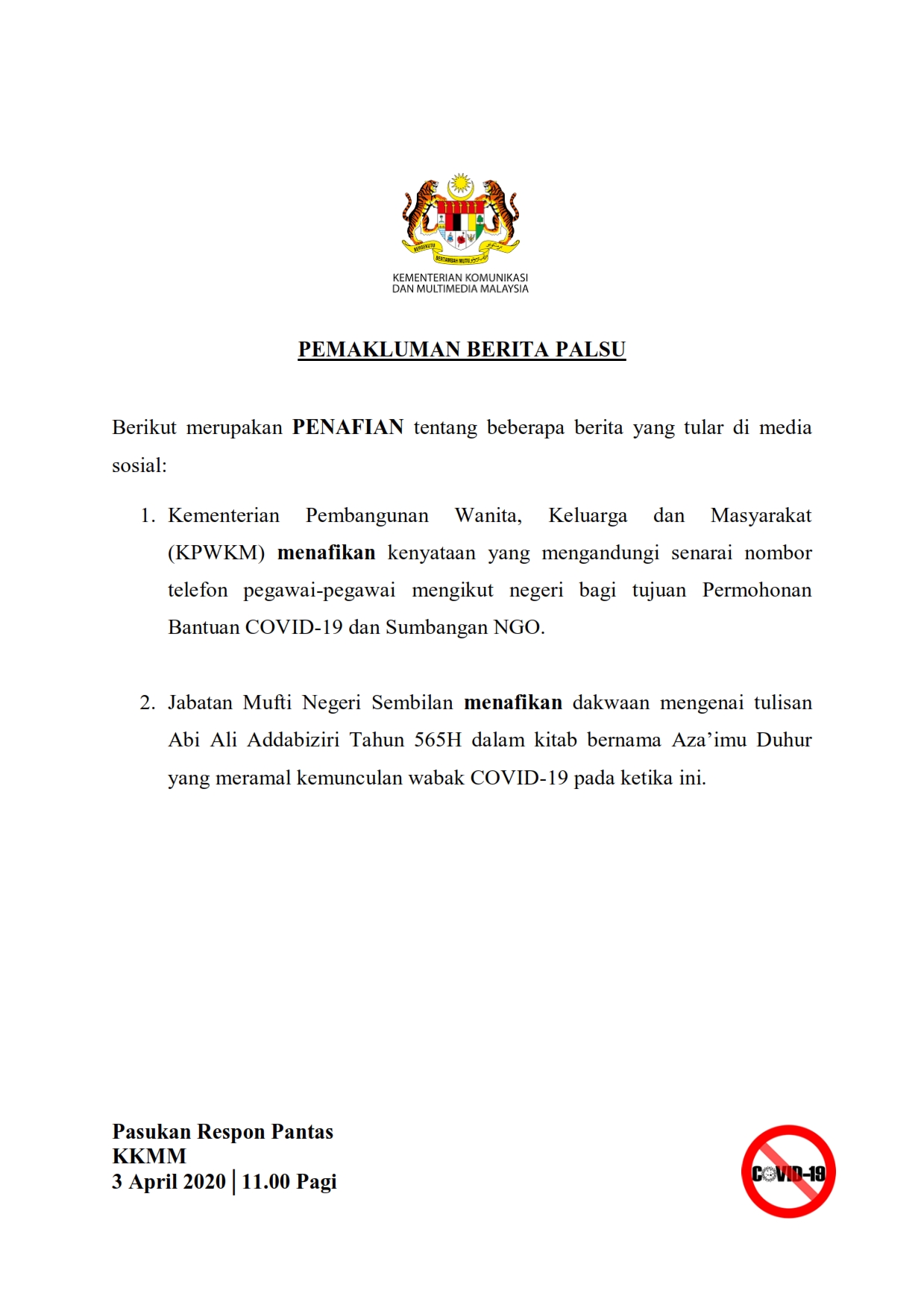 Pemakluman Berita Palsu SKMM 03/04/2020 1100 AM Aiman Siaran Media 03 April 2020 Jumlah paparan: 1096 Rating: ( 0 Rating ) Sila beri kadar Undi 1 Undi 2 Undi 3 Undi 4 Undi 5 Lihat / Muat Turun PDF Facebook Twitter Seterusnya Seterusnya