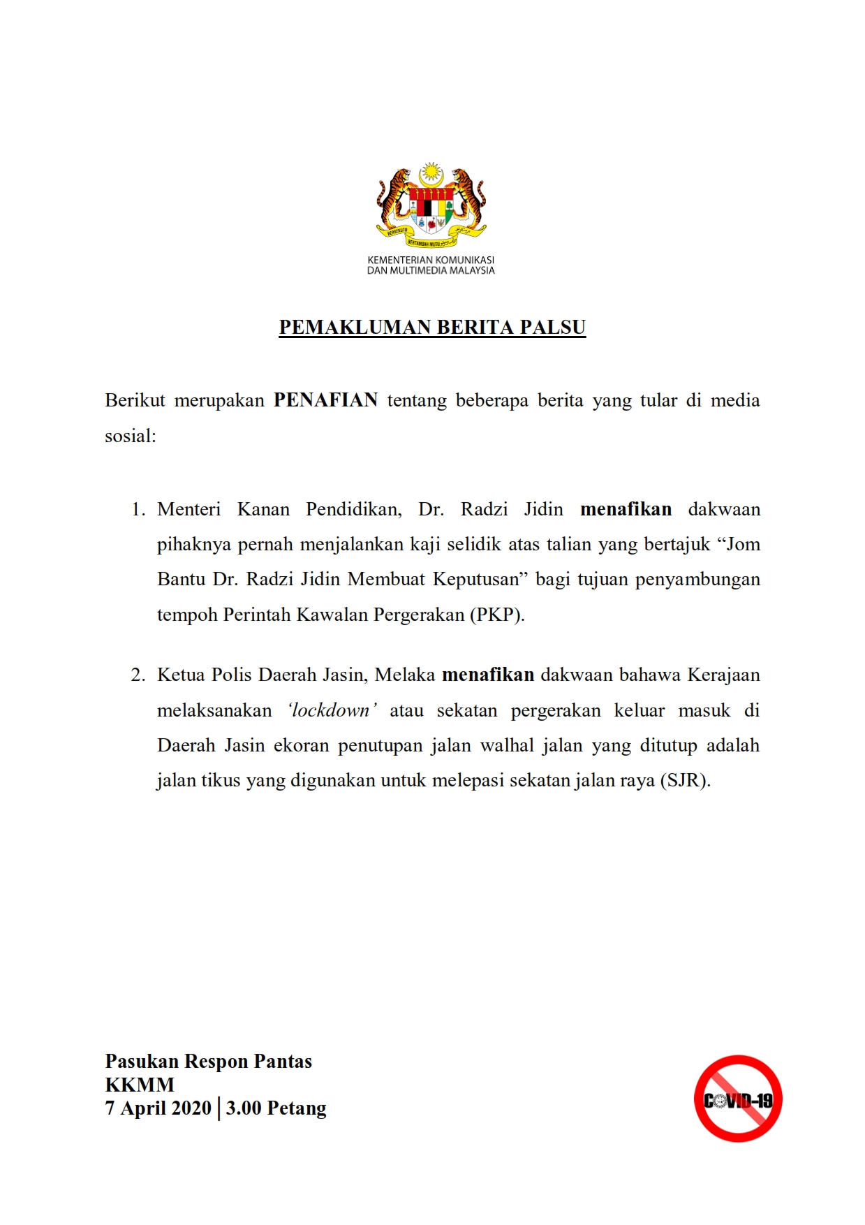 Pemakluman Berita Palsu SKMM 07/04/2020 0300 PM Aiman Siaran Media 07 April 2020 Jumlah paparan: 771 Rating: ( 0 Rating ) Sila beri kadar Undi 1 Undi 2 Undi 3 Undi 4 Undi 5 Lihat / Muat Turun PDF Facebook Twitter Seterusnya Seterusnya